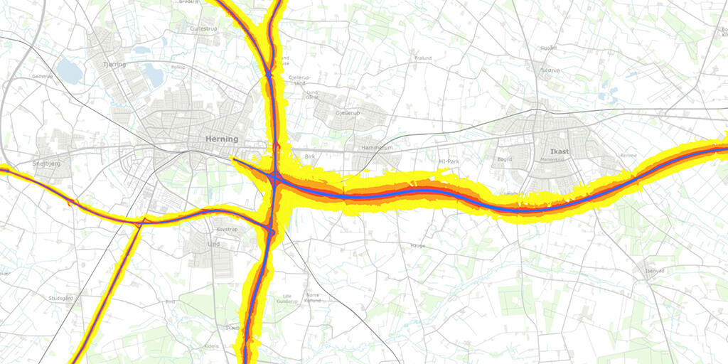 Miljøstyrelsen har lavet et støjkort, som viser, hvor meget det støjer fra de største veje og jernbaner i Danmark. Farverne viser, hvor meget støj, der er i et område. Den gule farve er det niveau, man anbefaler i boligområder. De andre farver betyder, at støjniveauet er for højt i forhold til de anbefalede grænseværdier.