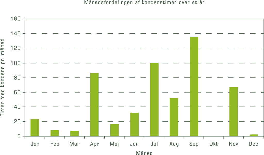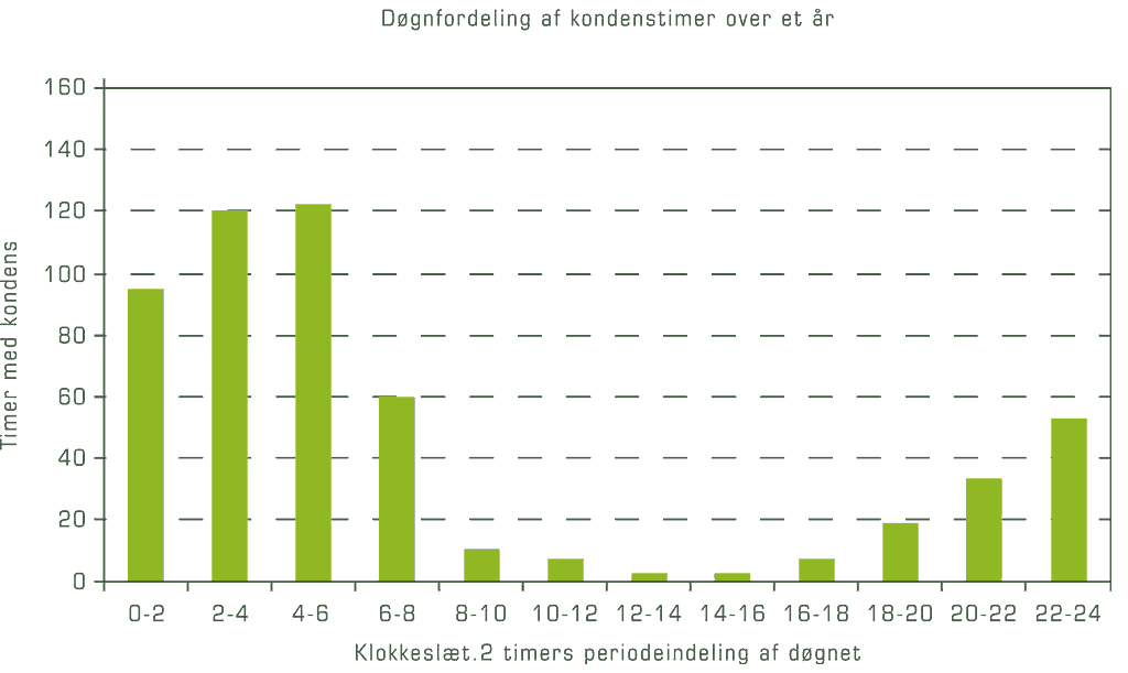 Nedenstående grafer viser, hvornår på året der er størst risiko for at opleve kondens på dine vinduer, samt hvilke tidspunkter på døgnet det forekommer.