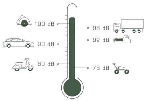 - Benzindrevet kædesav tæt på: 100-110 dB