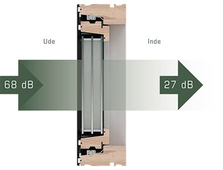 Hvis støjniveauet udenfor er 68 dB, hvilket svarer til en stor ringvej, vil et almindeligt vindue med termoruder typisk give et indendørs støjniveau på 38 dB, mens et vindue med lydrude og ekstra tætning* vil give et indendørs støjniveau på 27 dB.